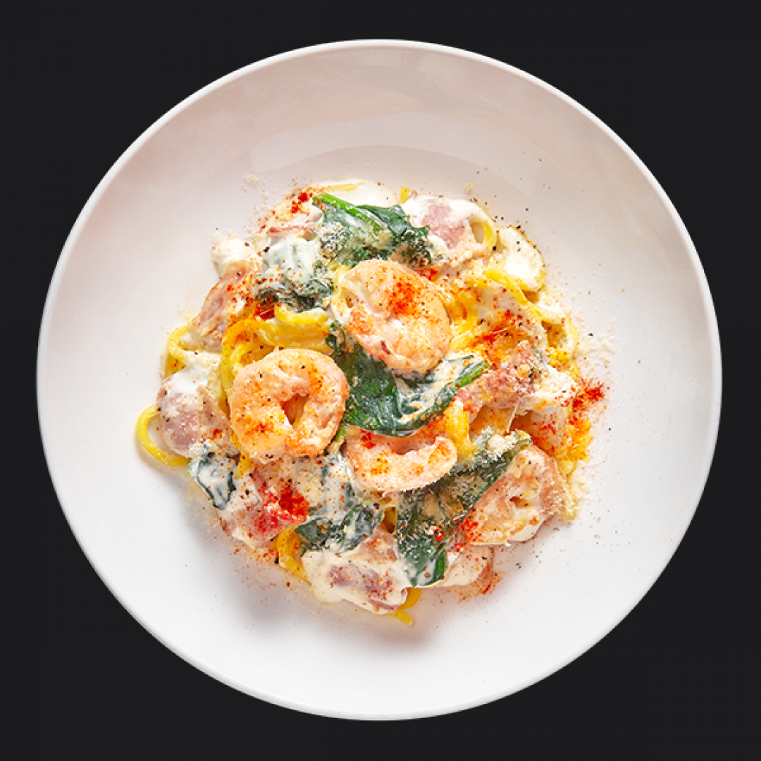 Креветки, бекон, сливочный соус с добавлением сыра дор блю, шпинат, сыр пармезан, копчёная паприка
