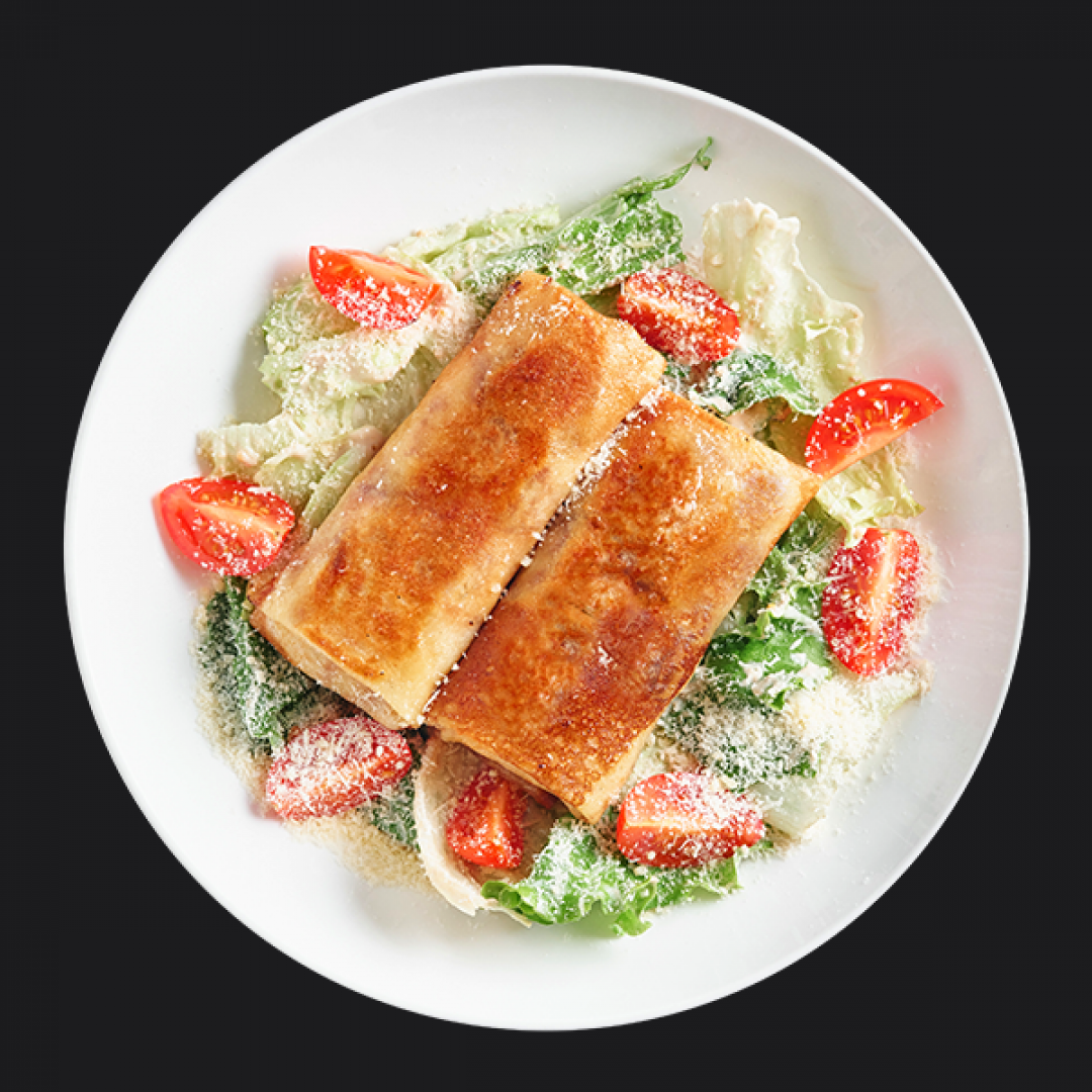 Блины с цыпленком, моцареллой и соусом бешамель, салат айсберг, соус цезарь, помидоры черри, сыр пармезан