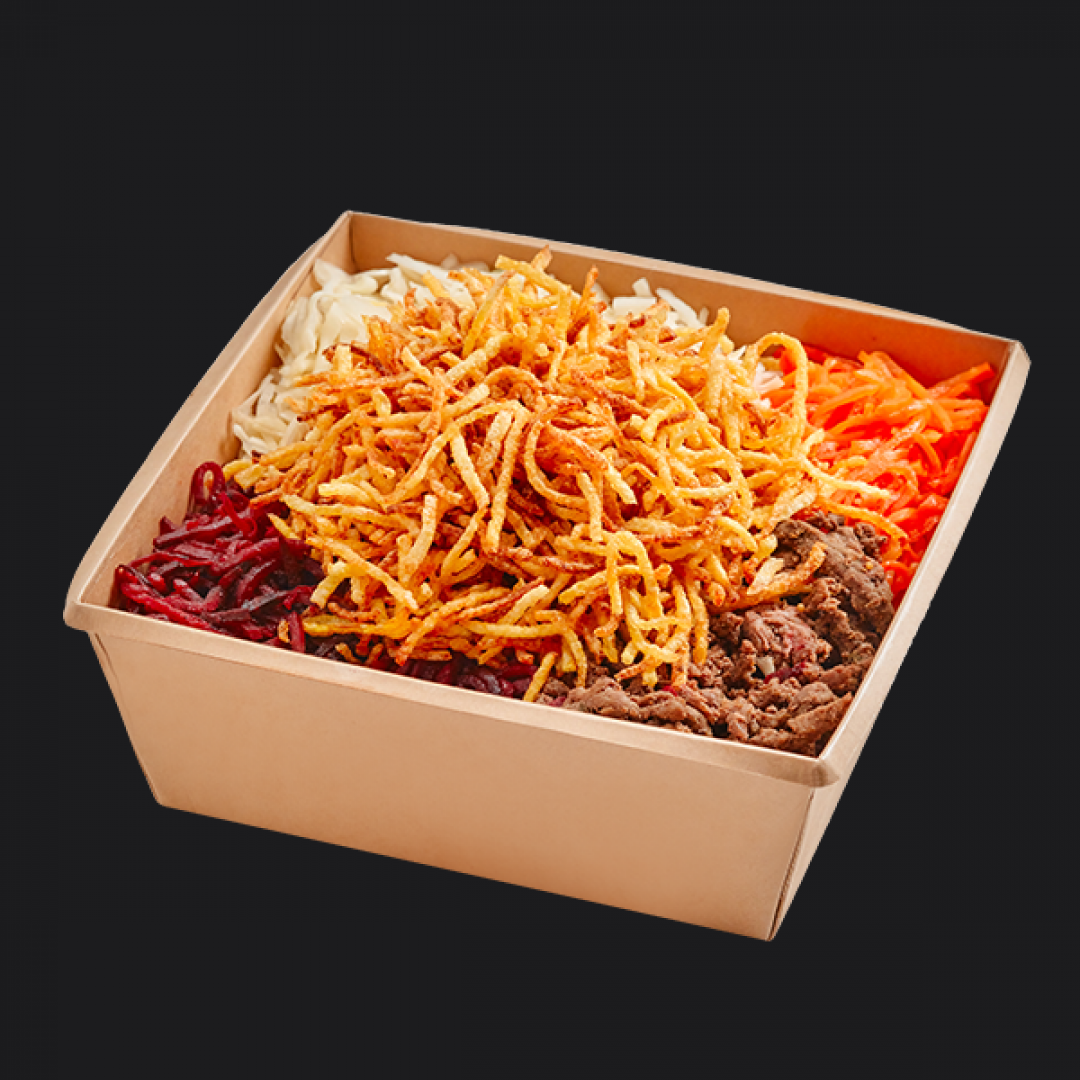 Говядина, морковь по-корейски, свёкла по-корейски, картофель пай, капуста, лук, майонез
