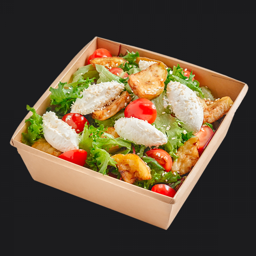 Баклажан фри, творожный сыр, томаты черри, микс зелени, соус сладкий чили, кунжут