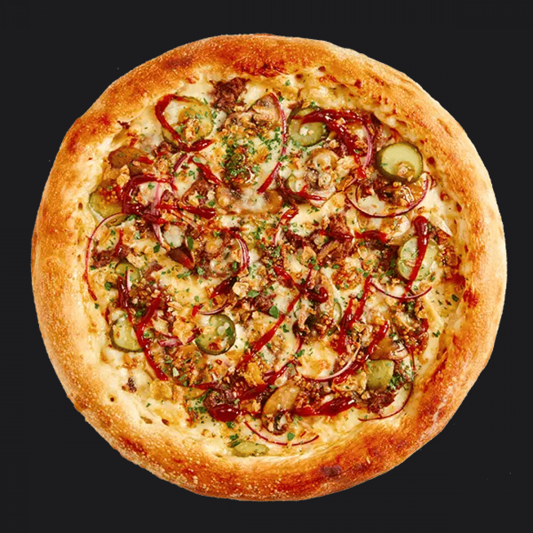Пицца с ветчиной, копченой курицей и томатами, Пицца с беконом, грибами и трюфельной сметаной, Пицца с рваной говядиной и маринованным огурчиками