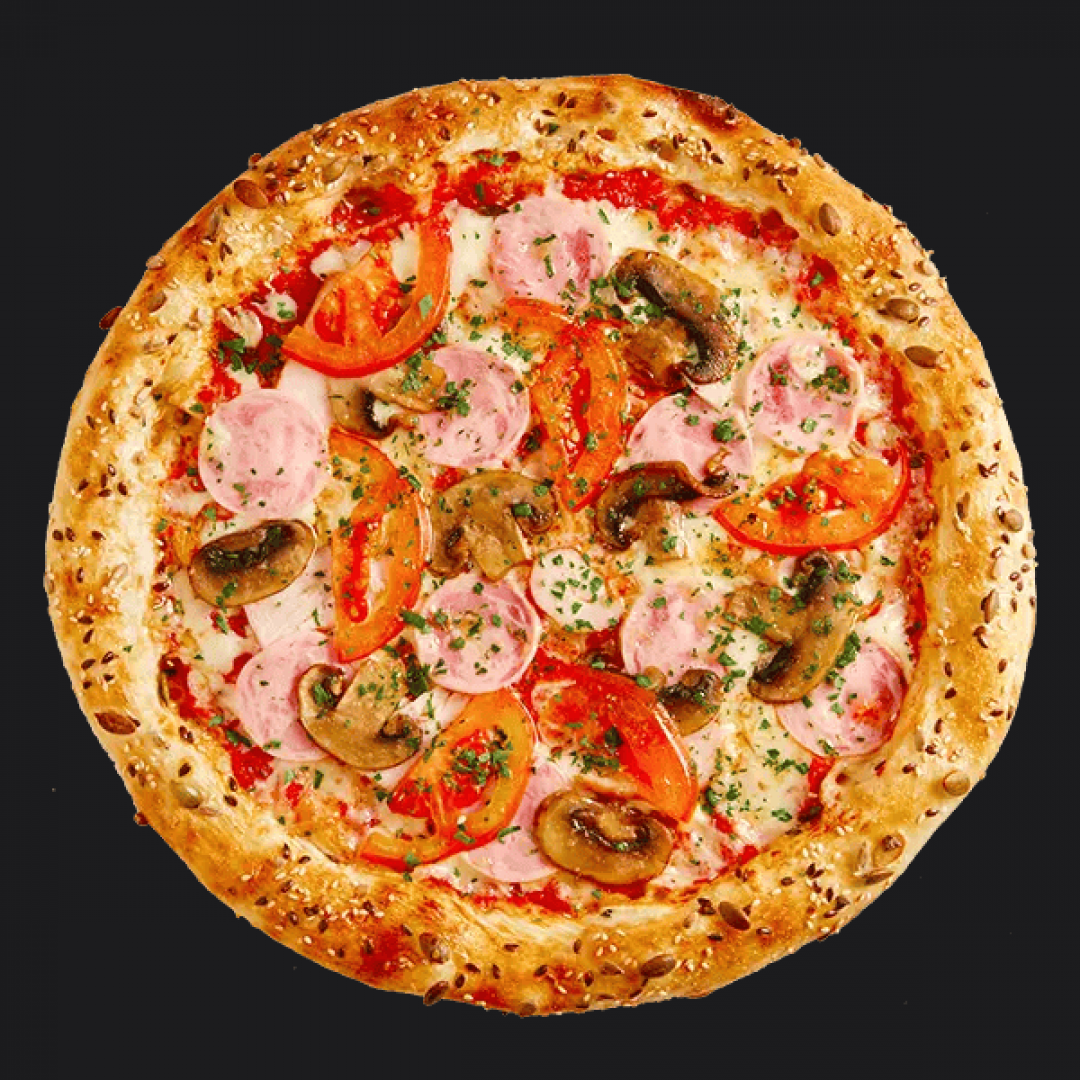 Ветчина, копченая курица, помидоры, соус помадоро, масло чесночное, петрушка, сыр моцарелла, смесь семян, шампиньоны, зелень