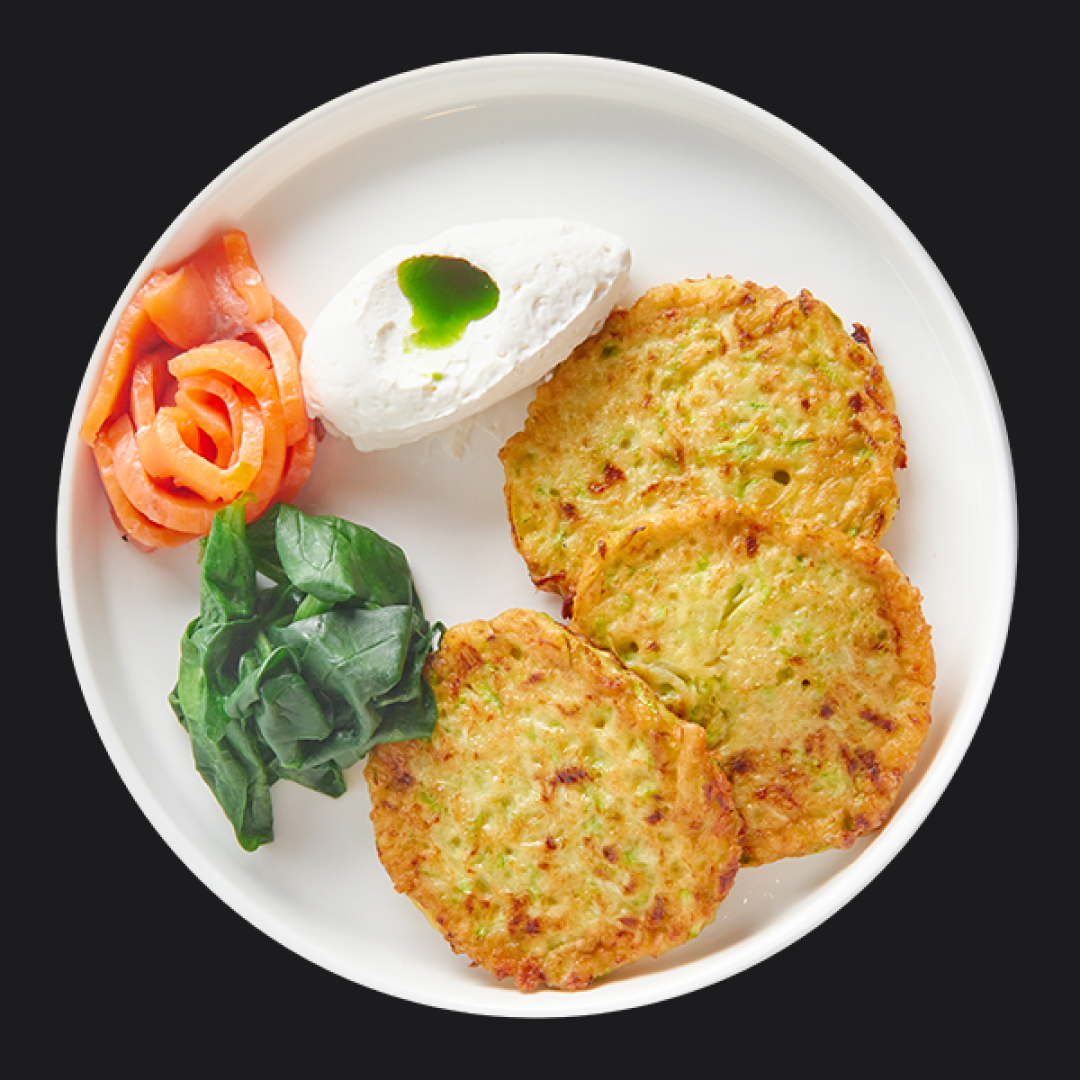 Драники из цукини, форель, соус крем-чиз, шпинат, зеленое масло