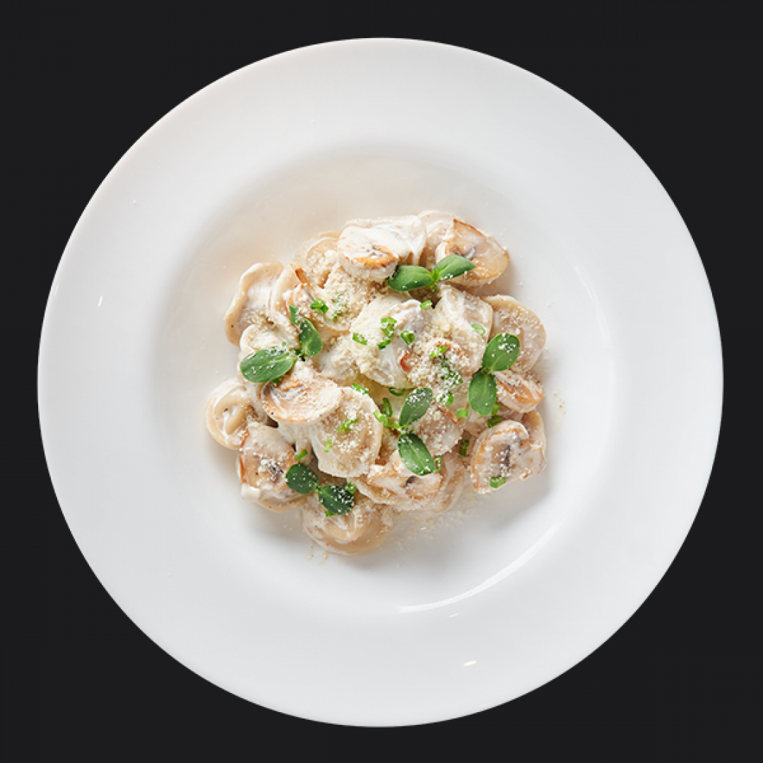 Пельмени с грибным соусом и пармезаном