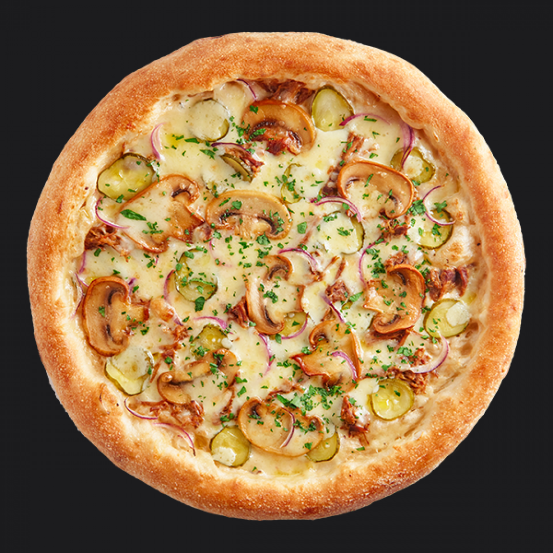 Говядина, шампиньоны, огурец консервированный, лук красный, соус грибной альфредо, петрушка, сыр моцарелла