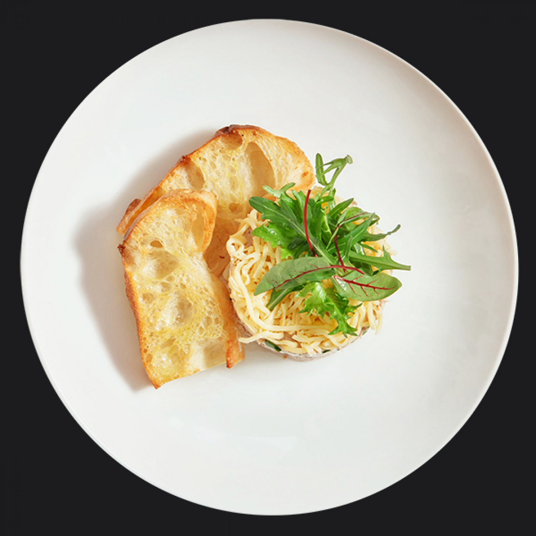 Яйцо, сыр гауда, тунец, зелёный лук, майонез, микс зелени, пшеничная гренка
