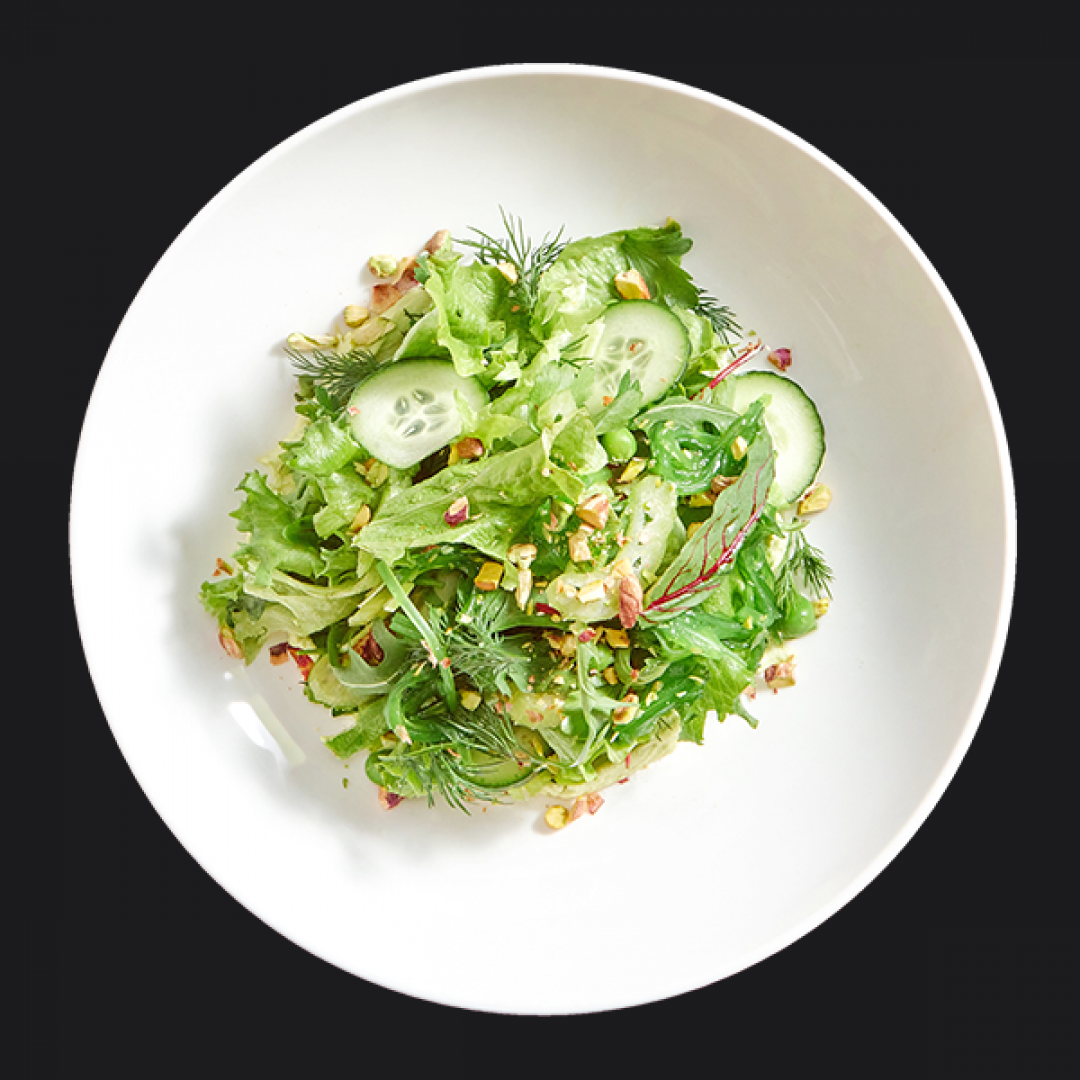 Микс зелени, салат айсберг, огурец, стебель сельдерея, соус с добавлением яиц и творожного сыра, соус ореховый, зелень, водоросли чука, фисташка, горошек