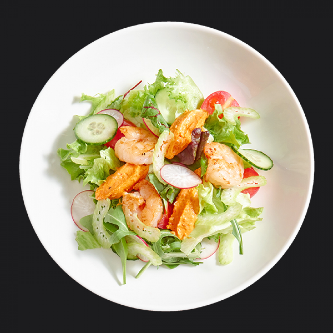 Креветки, микс зелени, салат айсберг, соус из печенного перца, черри, стебель сельдерея, редис, огурец, заправка на основе масла и соевого соуса