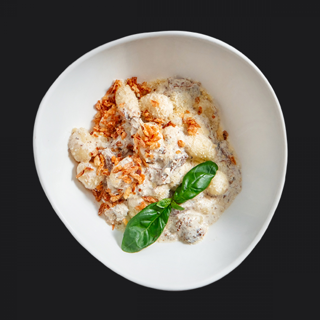 Ньокки, томлёная говядина, сливки, трюфельная паста, сушёные лук и чеснок, сыр пармезан