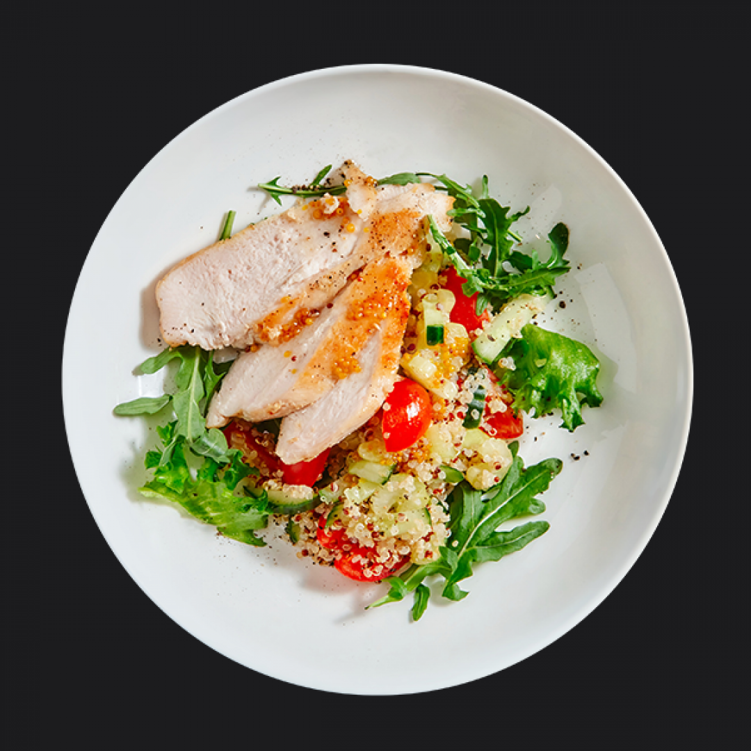 Цыплёнок, огурец, томаты черри, сельдерей, киноа, микс зелени, медово-горчичная заправка